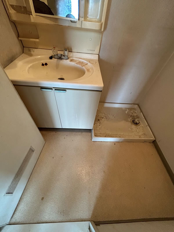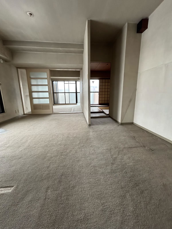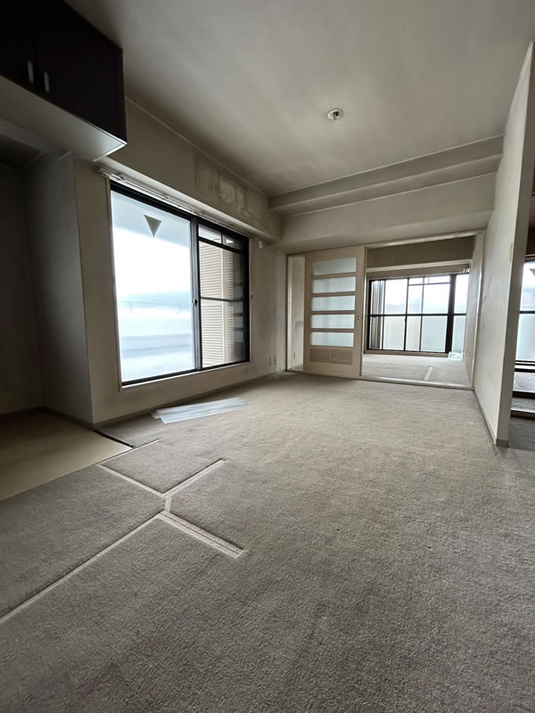 築39年のマンションの全面リフォーム工事。TV、コンセントも少なく床も39年前のカーペットの為、今回は全室をフローリングにしてお風呂も広げたい。