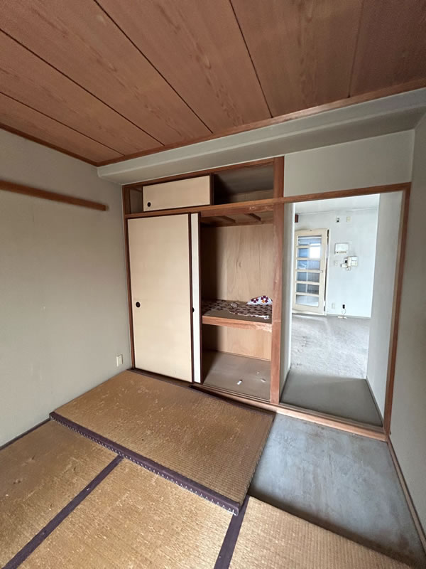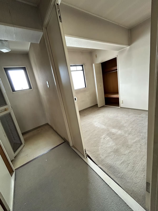 築39年のマンションの全面リフォーム工事。TV、コンセントも少なく床も39年前のカーペットの為、今回は全室をフローリングにしてお風呂も広げたい。 和室を洋室に変更し、押入を少し小さくする事でお風呂のサイズを少し大きくさせて頂きました。