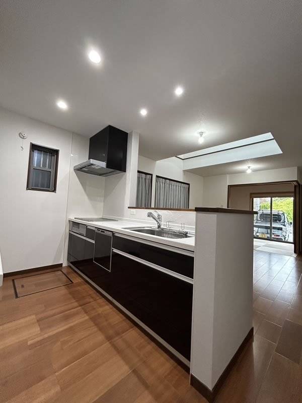 壁の撤去して対面キッチンの上部をすっきりさせたいとご相談を頂きました。 上記工事に加えリビングに吹き抜けがあり夏場暑くなる為、天窓にロールスクリーンを設置して日差しを遮るように致しました。 施工後には築年数も浅い為、今後の外壁塗装や屋根塗装、キッチン機器、浴室、トイレなど不具合が出てきた時の事もお願いしたいと言って頂きうれしく思っておりました。引渡し後1年ほどして実際にシャワートイレのご依頼があり取替えをさせて頂きました。